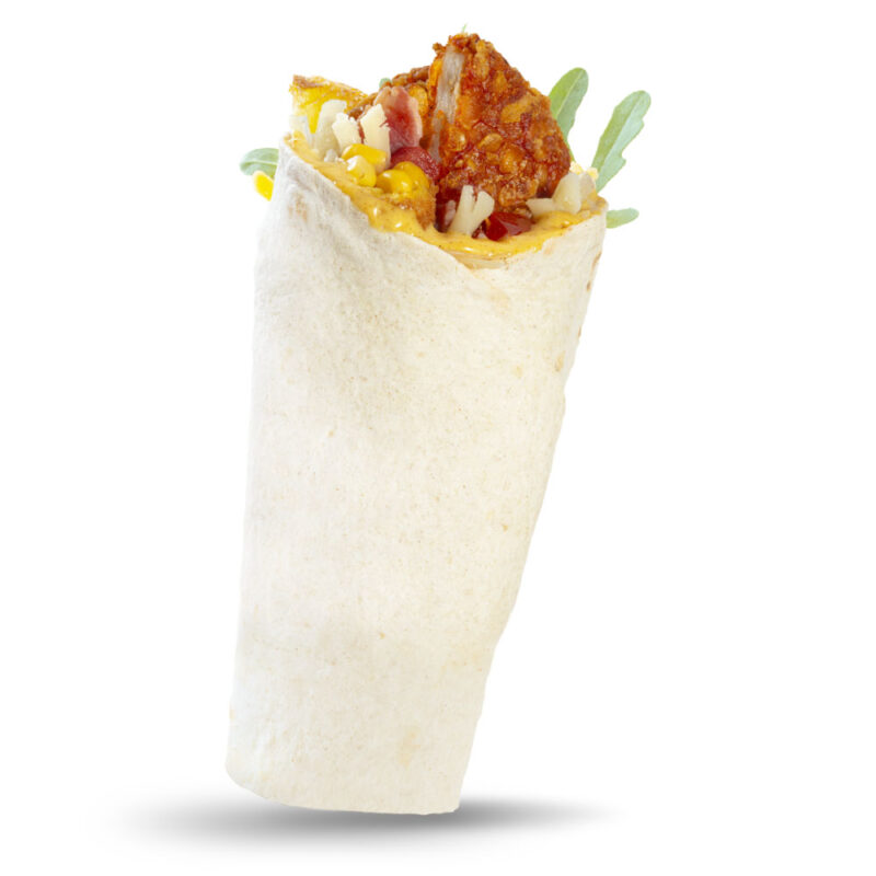 Tortilla, ropogós csirkemell filé, bacon, mango-curry szósz, reszelt cheddar és gouda sajtmix, sweet corn bites, kockázott paradicsom